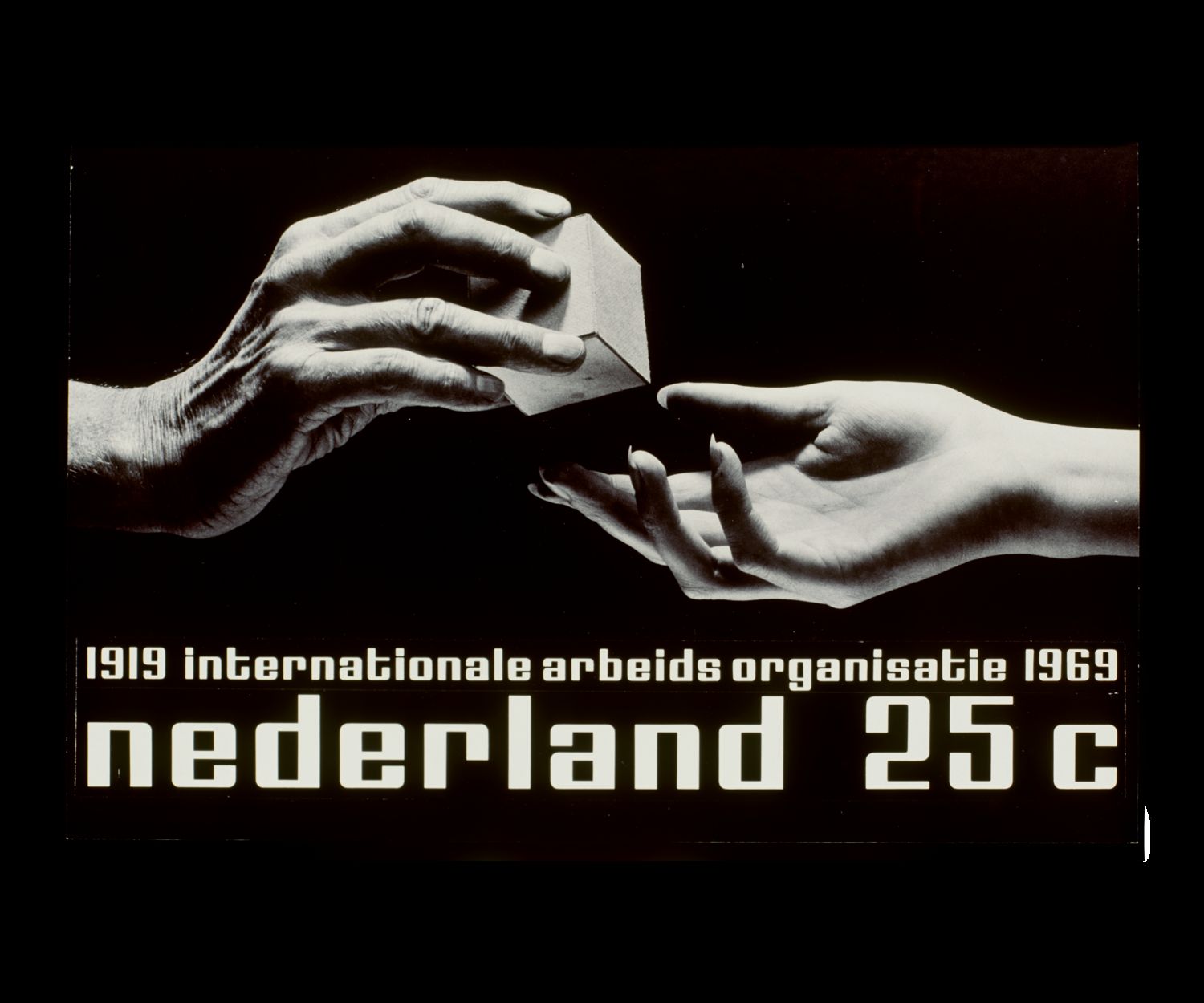 In 1968, the Dutch PTT (Posterijen, Telegrafie en Telefonie; the Dutch post office) commissioned Schrofer to design a stamp to celebrate the 50th anniversary of the the International Labor Organization—in Dutch, Internationale Arbeidsorganisatie (IAO)—in 25c and 45c (gulden) denominations.