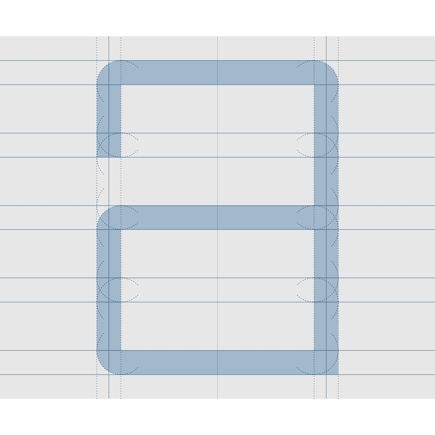 Schrofer chose 3- and 1-unit horizontal strokes, and 5- and 1-unit horizontal counters, for the two sizes of letters. Leaving two units of space between the lines, and one unit above and below the text, gave the number of height units of the element letter grid: 28.