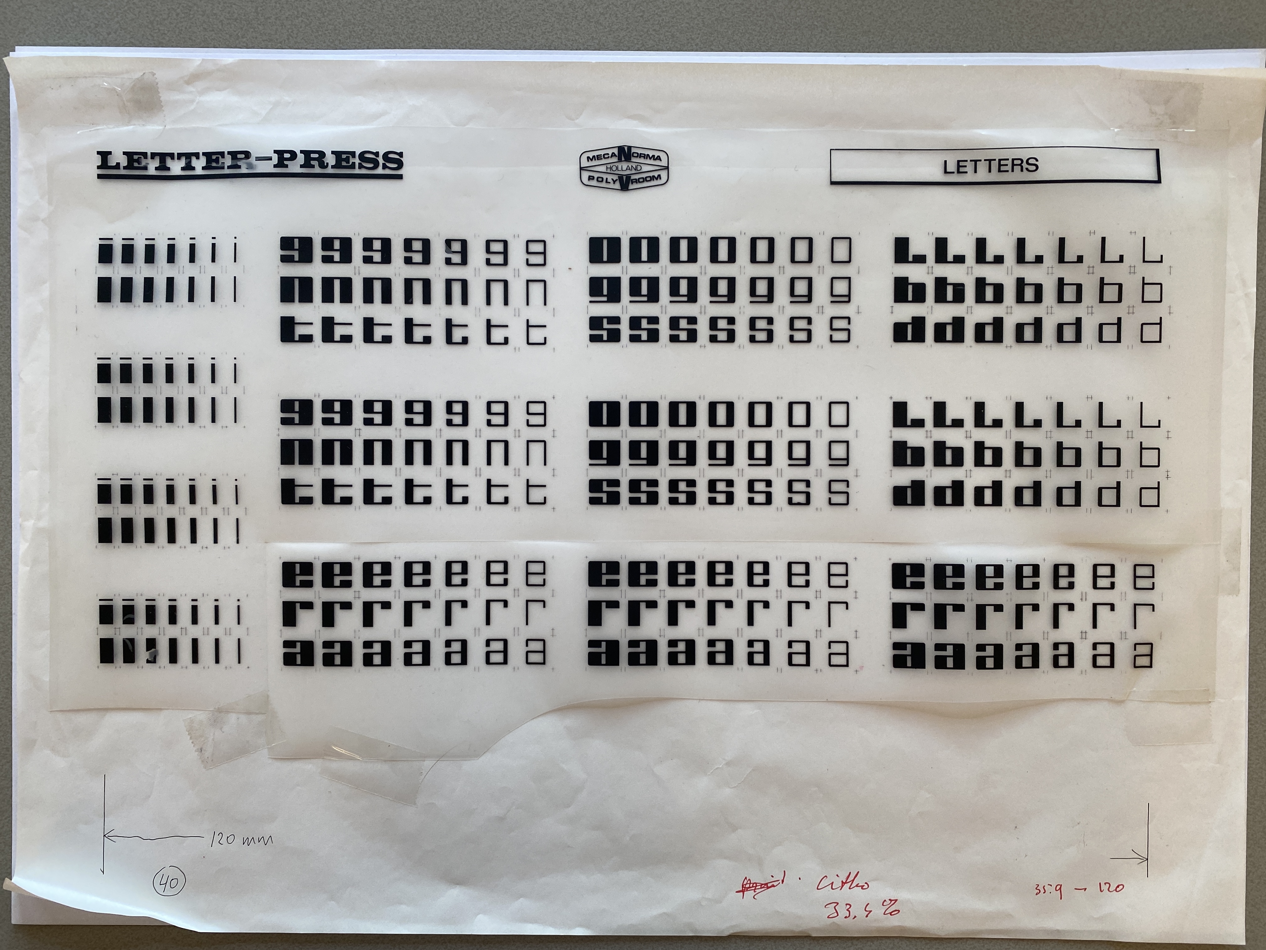 The transfer letters were rubbed down on loose mylar/acetate taped to a piece of graph paper for alignment. It makes sense that Schrofer would have reused the mechanical and swapped the 2/4 in the field by carefully cutting one out of the sheet and replacing it with the other. There are other examples of this kind of manual/material editing in his archives.
